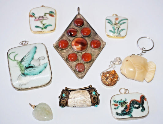 9x Vintage & Antique Oriental Silver Chard & Jade Mixed Pendant Lot (Yam)#18