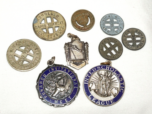9Pc Hawaii Mixed Group of Punahou School Pendants & Old Transport Tokens (ChR)