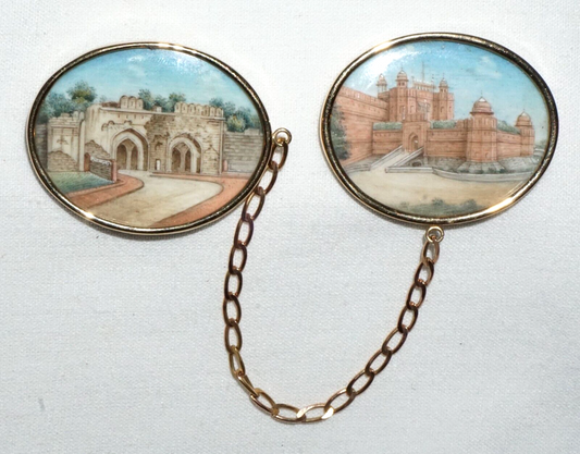 Antique 14k Yellow Gold Oval Painted Plaque w. Castle Motif Double Brooch (GeB)6