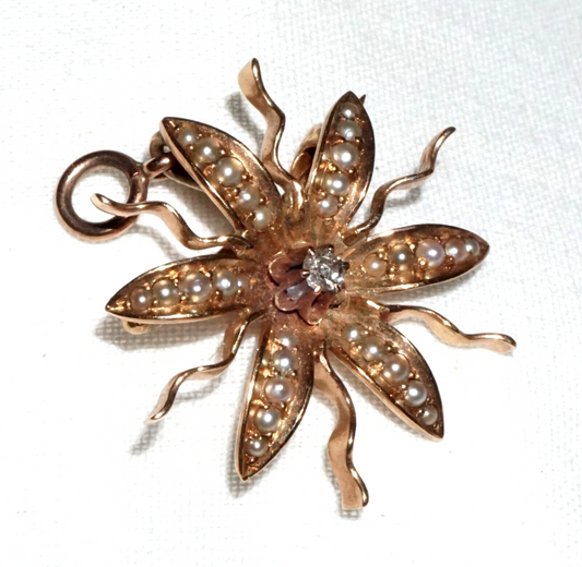 Antique Sunburst Motif Yellow Gold Brooch Pendant w. 30x Pearls & Diamond (GeB)6