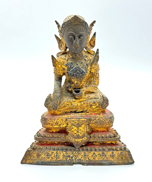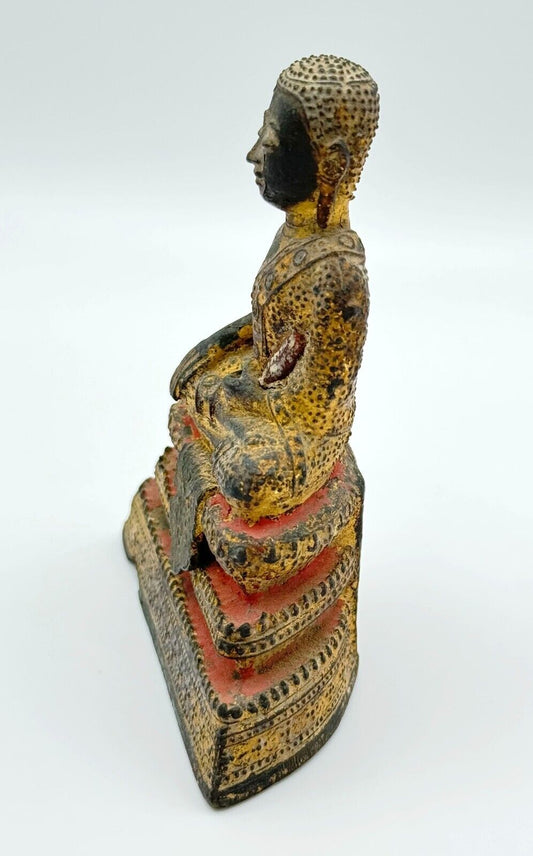 Antique Thai Maitreya Buddha Sculpture Seated Lacquered Bronze & Gilded (MiM)