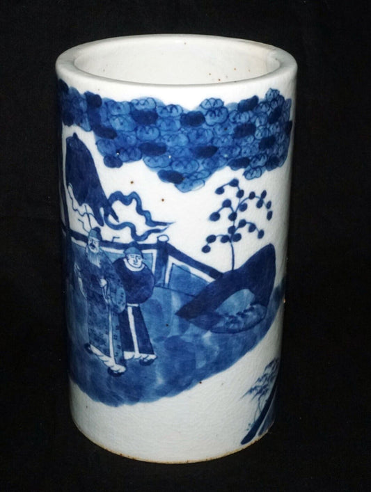 Chinese Blue & White Pottery Brush Pot w. Court-scene w Garden Motif (LeL) IC