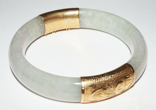 Chinese 14K Yellow Gold Off White Jadeite Jade Hinged Bangle Bracelet (NaD)#12a