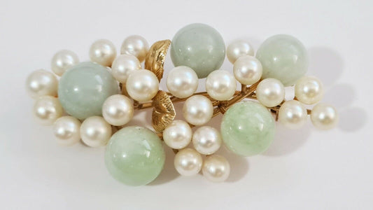 Chinese 14k Yellow Gold Brooch w. 5x Green Jades & 23x Pearls by Ming's (NaD)#6b