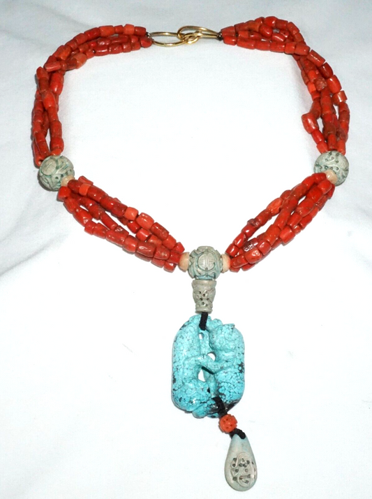 Chinese 14k Yellow Gold & Red Coral Bead Necklace w. Turquoise Pendant (GeB)#16