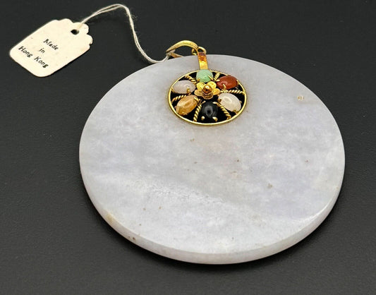 Chinese 14k Y Gold White Jadeite Open Cut Disk Pendant w Cabochon Accents (MeC)