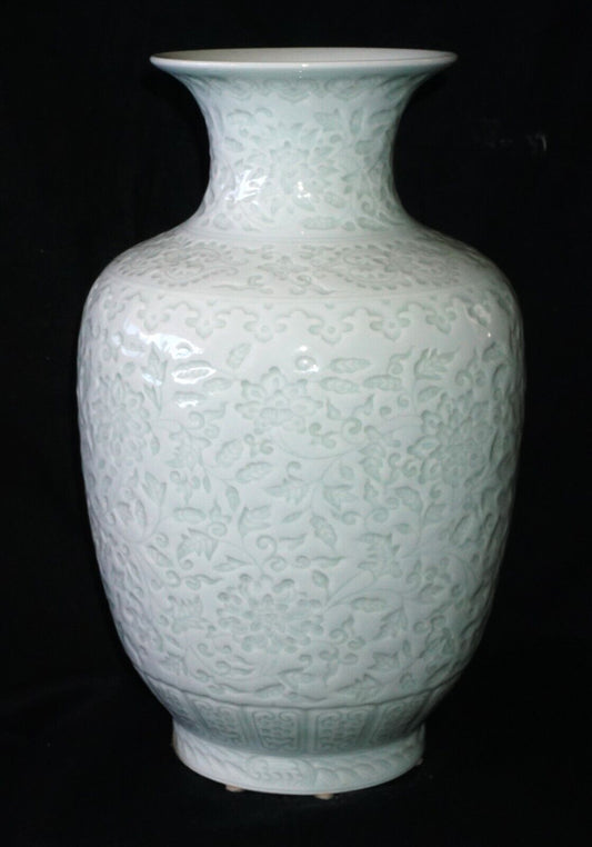 Chinese Molded Celadon Vase w Flared Rim & Floral Relief Motif & Qianlong (HiC)