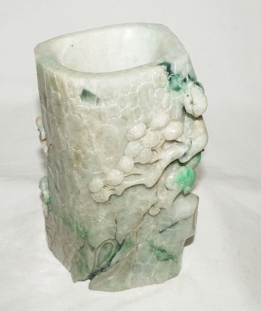 Chinese Jadeite Jade Carved Brush Pot w. Pine Tree Stump & Lingzhi Motifs (InS)