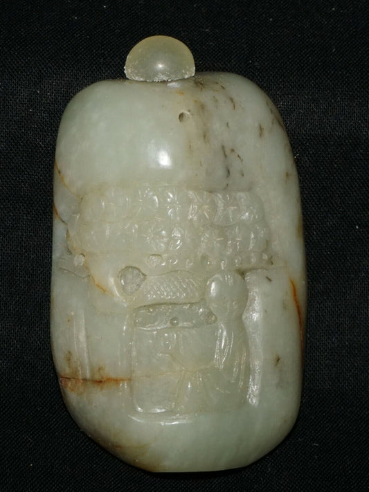 Chinese Jade Pebble Carved Snuff Bottle w. Figure under Pine Tree Motif (LeS) G2