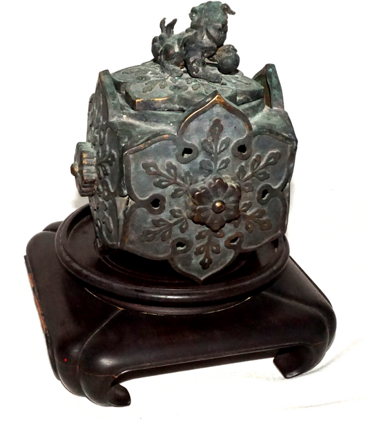 Chinese Bronze Flower Motif Incense Burner w. Foo Dog Finial on Base (WiR)
