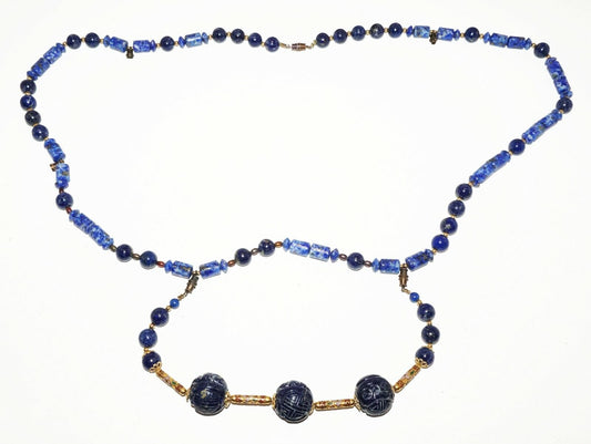 Chinese Lapis Lazuli Bead Necklace & Bracelet w. Plain & Carved Beads (HaY)#19