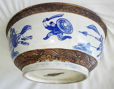 EARLY 20CT CHINESE BLUE & WHITE LG STONE WARE BOWL w. WARRIOR MOTIFS (BTG)