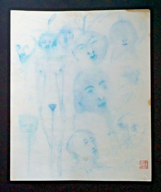 France HI Outsider Art Blue Pencil Painting Figures by Claude Vedel (EtJ)#25