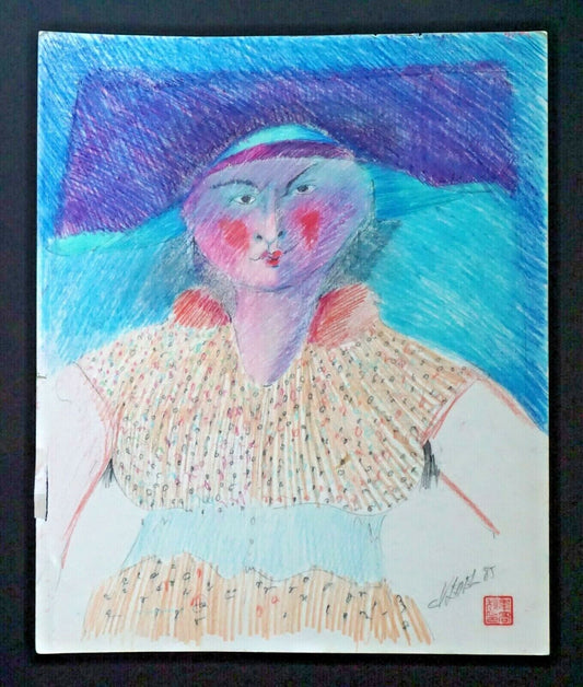 France HI Outsider Art Color Pencil Painting Woman w Hat Claude Vedel (EtJ)#31