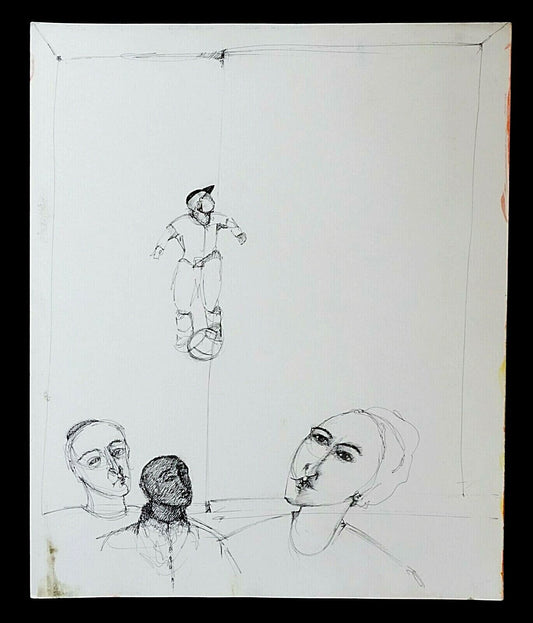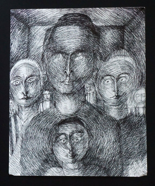 France HI Outsider Art Pen & Ink Painting Judaica Family Claude Vedel (EtJ)#52