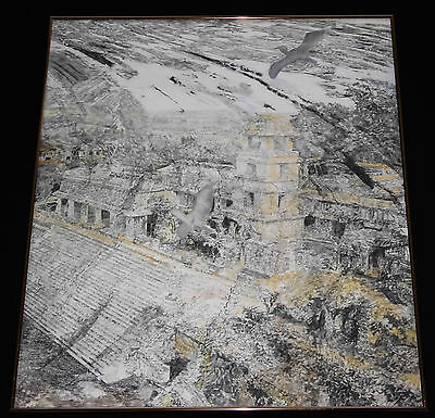 HAWAII ABSTRACT GRAPHITE PAINTING "CRANES FLYING over PALACE" by JEFF DUNN (BTG)