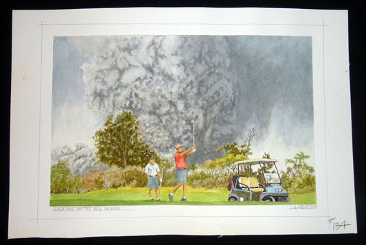 Hawaii Watercolor Painting Golfing & Volcanic Eruption Hawaii by L. Segedin #134