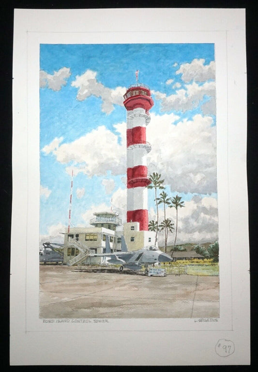 Hawaii Watercolor Painting Ford Island Control Tower Pearl Harbor L. Segedin #97