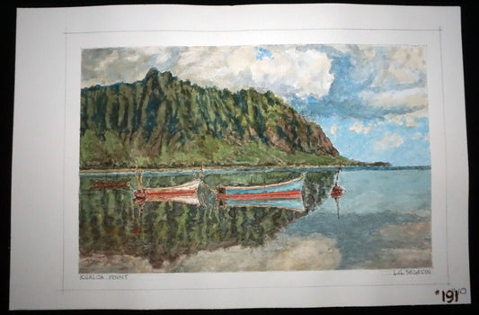 Hawaii Watercolor Painting Kualoa Point with Fishing Boats by Larry Segedin #191