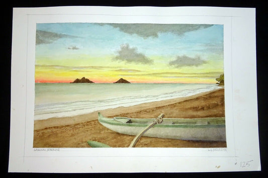 Hawaii Watercolor Painting Lanikai Sunrise & Beached Outrigger L. Segedin #125