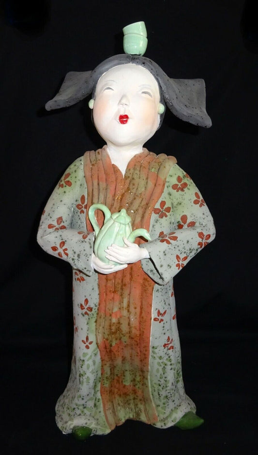 Hawaii Whimsical Pottery Sculpture "Celadon Waitress" by Vicky Chock (Z)