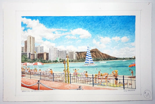 Hawaii Watercolor Painting Waikiki Waterfront & Diamond Head by L. Segedin #119