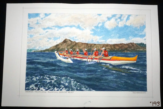Hawaii Watercolor Painting Woman Paddlers Rounding Diamond Head L. Segedin #193