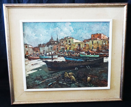 Italian Oil Painting "Fishing Village & Beached Boats" by P. Varchetta (FeO)