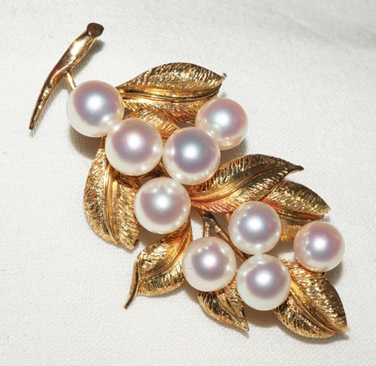 Japanese 14K Yellow Gold Brooch w. Leaf Motifs set w. 9x Pearl Accents (OdC)
