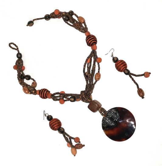 Multi Strand Coconut Shell & Wood Bead Ethnic Necklace & Earring Set (MaM)9