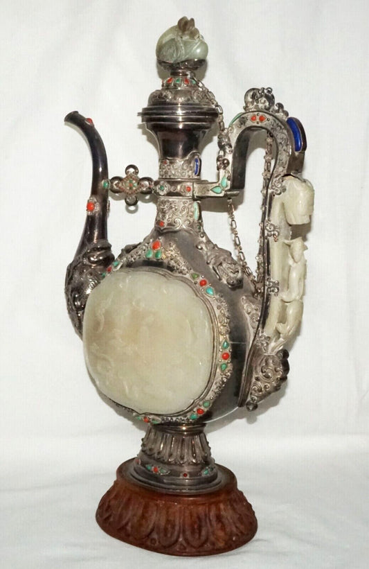 Mongolian Silver Ewer w. White Jade Plaques Dragon Hook Coral Turquoise (LeD)