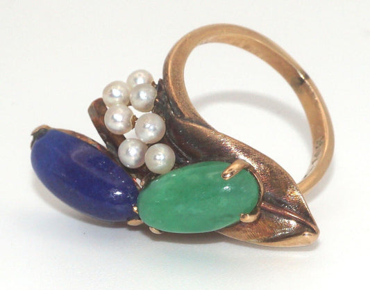 14k Yellow Gold Cocktail Ring Sz. 5 1/4 w Lapis, Jadeite & Mini Pearls (LeD)
