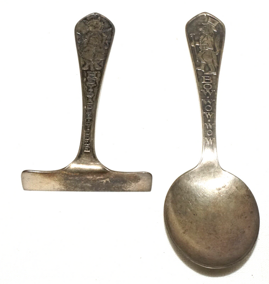 Pair 1930s US Sterling Silver Baby Utensils Bow Wow/ Hey Diddle McChesney (CrT)