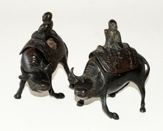 Pair Japanese Meiji Small Bronze Incense Burner w. Figure on Ox Motif (FLA)