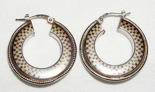 Pair Vintage Italy Modernist 18k White Gold Checker Pattern Hoop Earrings (JoD)