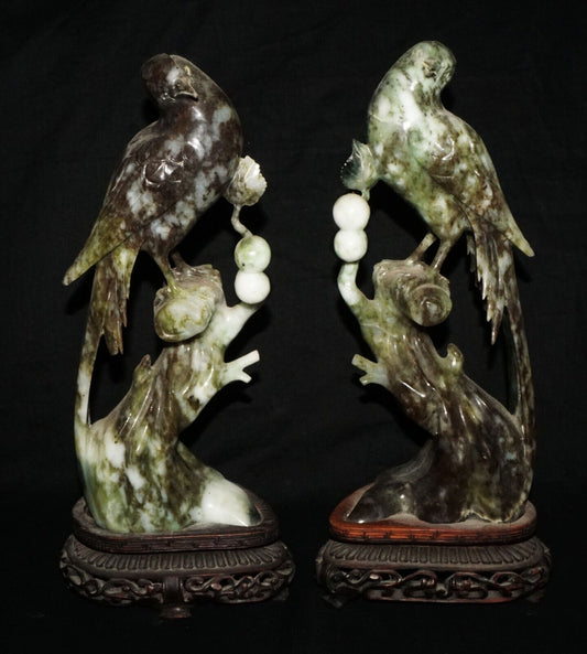 Pair Vintage Chinese Mottled Black Jadeite Jade Carvings Exotic Birds (LeD)