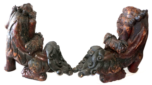 Pair Vintage Chinese Large Carved Assembled Hardwood Lion Dogs Inset Eyes (ChB)