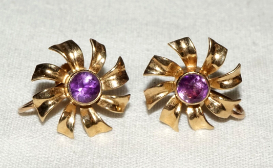 Pair Vintage 14k Yellow Gold Flower Motif Earrings w. Amethyst Accents (KoS) L13