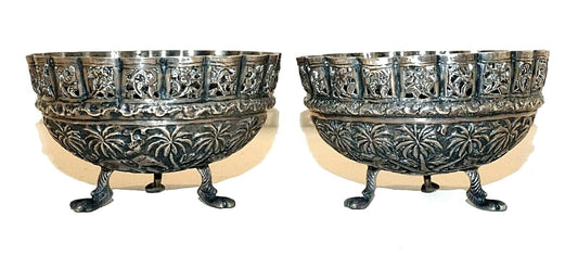 Pair Vintage Indian Pure Silver Tripod Pierced Jungle & Animal Motif Bowls (ThB)
