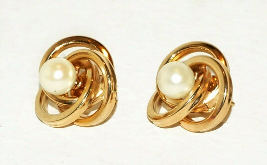 Pair Vintage 14K Yellow Gold Triple Ring and Pearl Design Earrings (HaL)#3