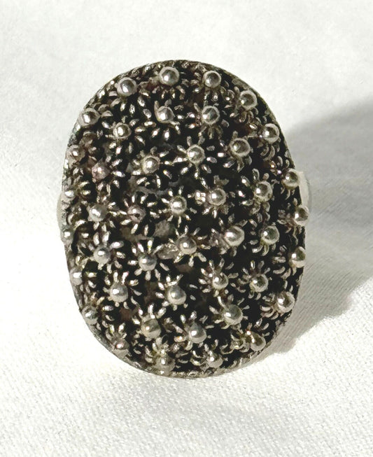 Sterling Silver 925 Oval Half Dome Ring w Floral Beaded Accents (KiL)23