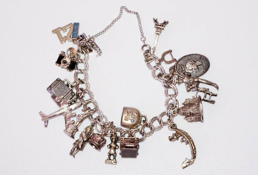 16Pc x Vintage Silver & Silver Plated Assembled Travel Charm Bracelet (Pas)