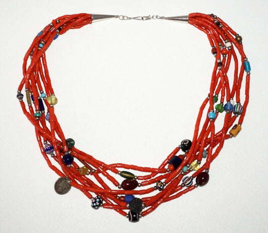 US Aboriginal Natural Fiber 8xStrand Red & Glass Trade Bead Necklace (RgR)