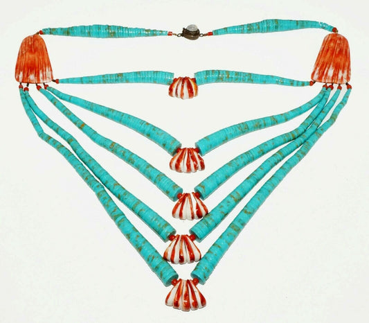 US Aboriginal Tribal 5 Strand Turquoise Bead & Red Shell Necklace (HaY)#20