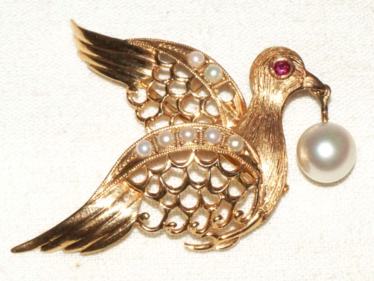 Vintage 14k Yellow Gold Dove Motif Brooch Pendant w. Ruby & Pearl Accents (KiL)