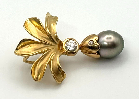 Vintage 14k Yellow Gold Floral Pendant w Diamond & Black Pearl Accents (KnK)