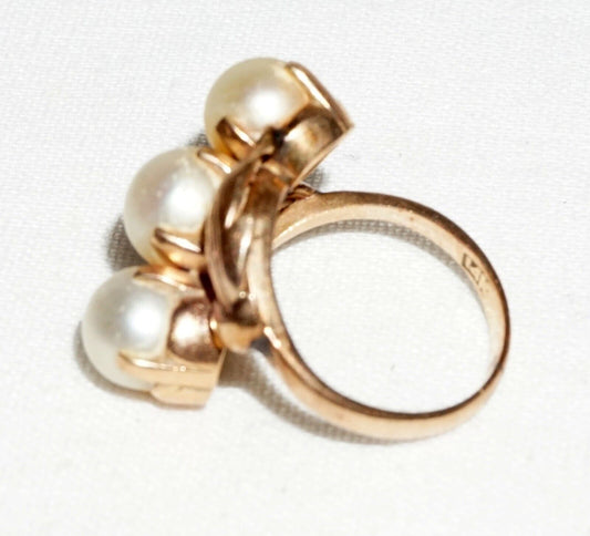 Vintage 14k Yellow Gold Leaf Motif Ring Sz.3.5 set w. 3x Pearl Accents (---)