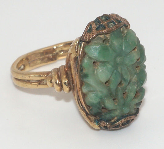 Vintage 14k Yellow Gold Filigree Ring Sz. 7 1/4 w Carved Floral Jadeite (LeD)