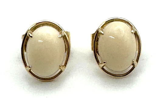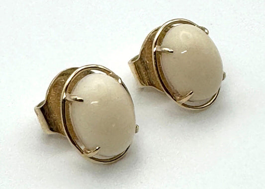 Vintage 14k Yellow Gold Oval Earrings set w. White Coral Cabochons (KnK)