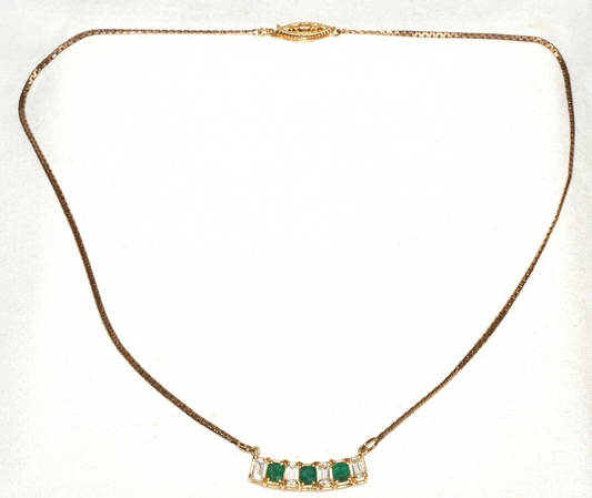 Vintage 14k Yellow Gold Necklace w. Bar Pendant 3x Emeralds & 4x CZ's (GoB) #29